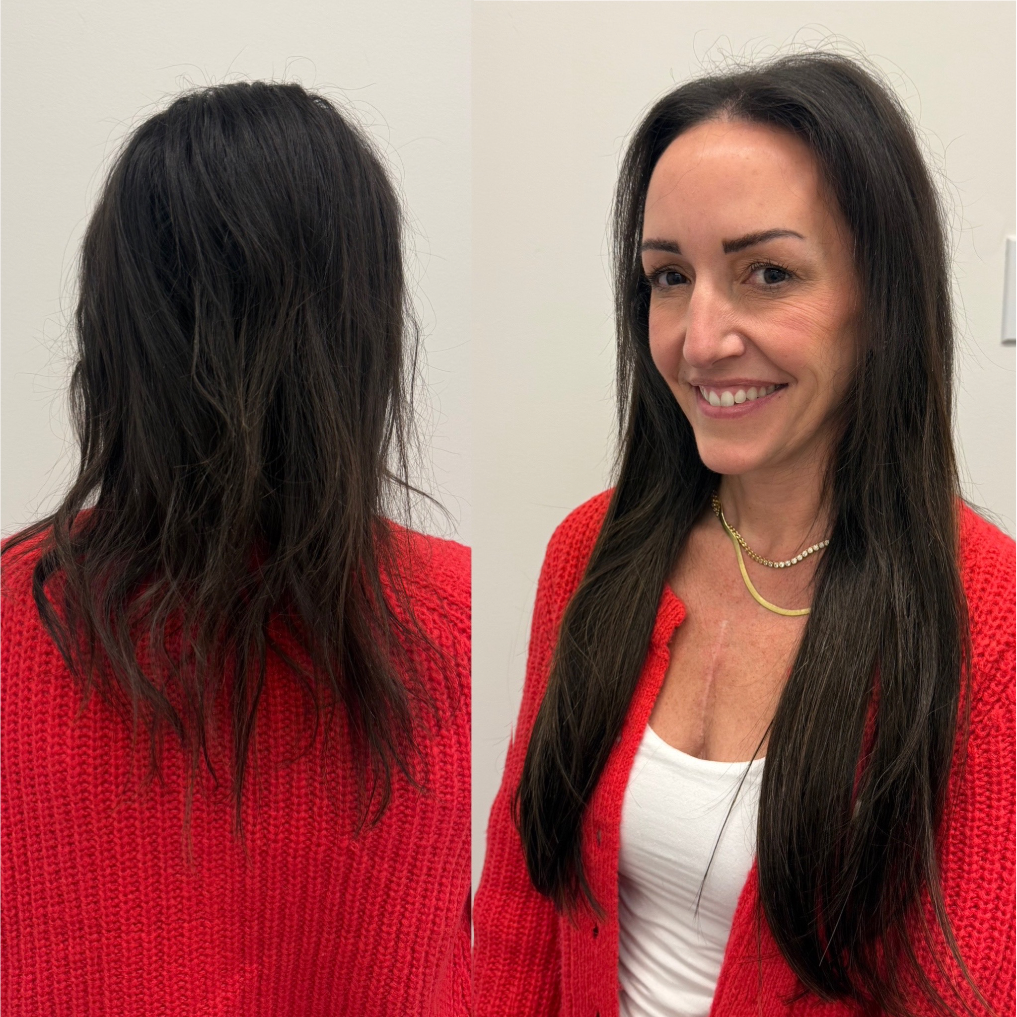 Super fine, shorter hair with long-term growth goals. She loves length, but struggled with blending around the hairline—especially because she’s active and doesn’t want extensions sitting too close to her face.